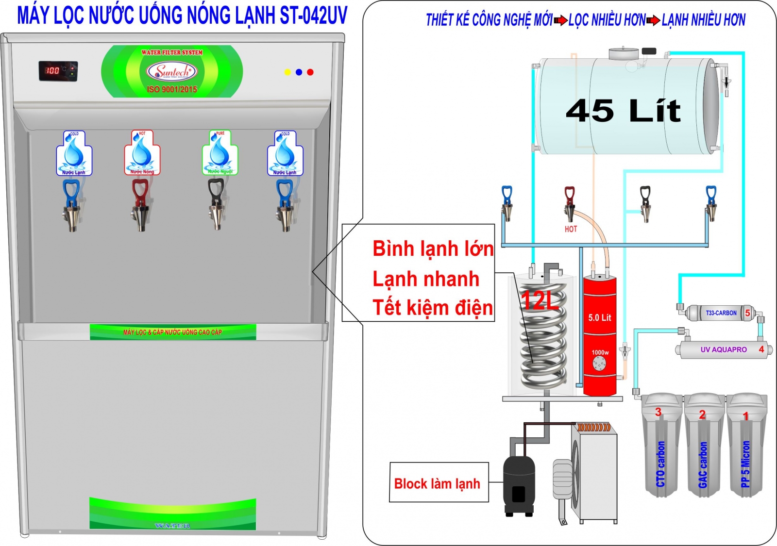 Model: ST-042UV là dòng máy được thiết kế Lọc - Làm nóng lạnh nước uống trực tiếp sử dụng cho số lượng đông người.