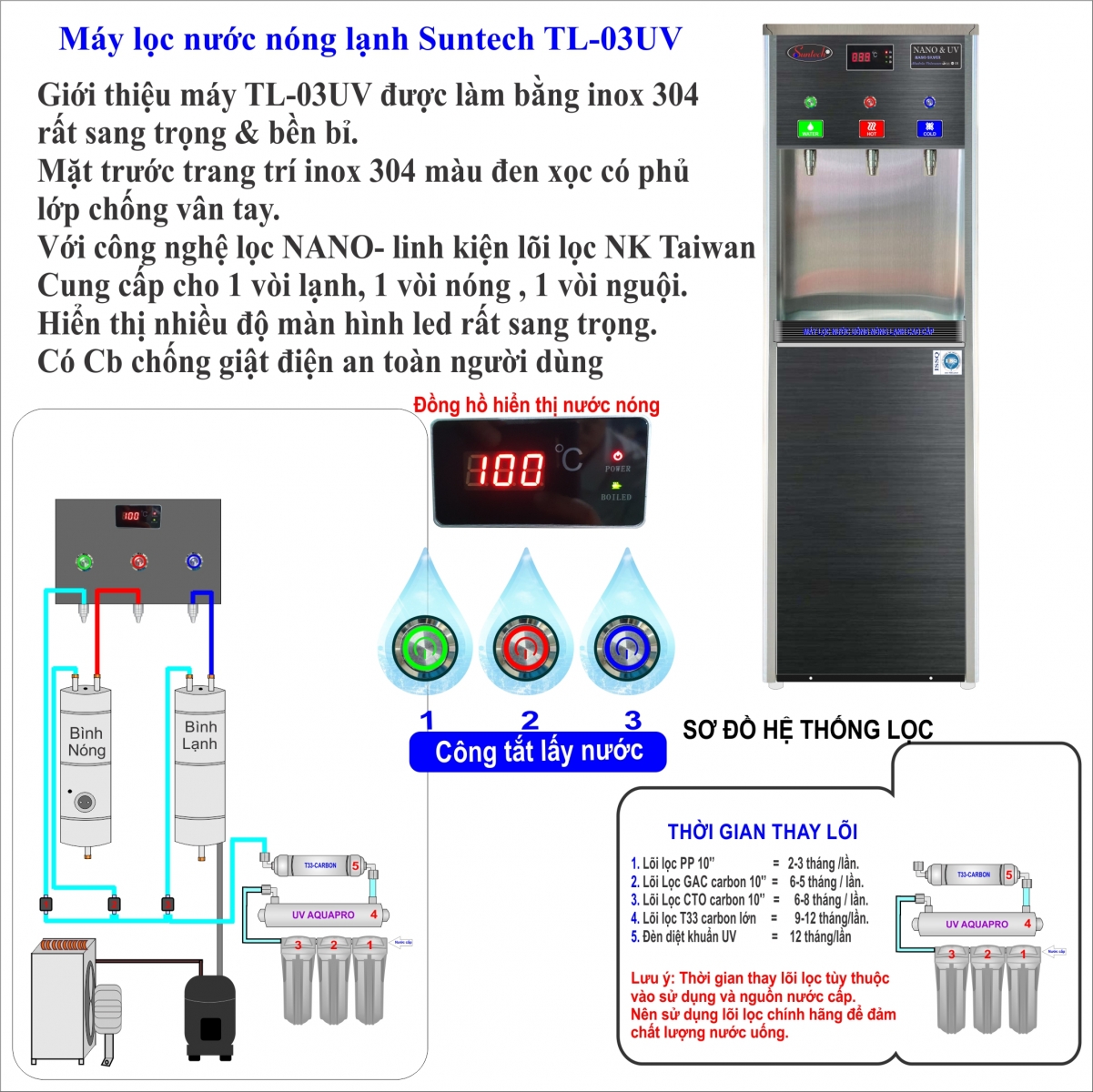 Việt Nam là đất nước có nguồn nước khá phức tạp với nguồn nước máy, nguồn nước ngầm bị ô nhiễm. Hiện nay sức khỏe con người ngày càng bị đe dọa bởi những tác nhân ngoài môi trường ô nhiễm vào nguồn nước vì 75% cơ thể con người là nước. Đứng trước thực trạng đó và sau nhiều năm nghiên cứu, thí nghiệm với nhiều cấu tạo hệ lọc khác nhau, Nay sản phẩm máy lọc nước 3 vòi Suntech TL-03UV đã cải tiến các thiết bị lọc, van vòi, và các hệ thống dẫn nước để cho máy được hoạt bền bỉ và đạt biết giá thành thấp nhất có thể.